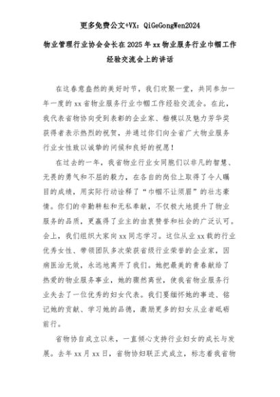 【七哥公文】2025年:物业管理行业协会会长在2025年xx物业服务行业巾帼工作经验交流会上的讲话+更多免费公文+VX:QiGeGongWen2024+更多免费公文+VX:QiGeGongWen2024