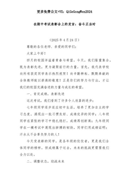 【七哥公文】2025年:在期中考试表彰会上的发言:奋斗正当时+更多免费公文+VX:QiGeGongWen2024+更多免费公文+VX:QiGeGongWen2024