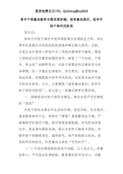 【七哥公文】2025年:青年干部廉洁教育专题党课讲稿:培育廉洁意识,筑牢年轻干部作风防线+更多免费公文+VX:QiGeGongWen2024+更多免费公文+VX:QiGeGongWen2024
