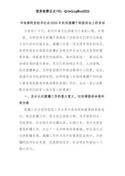 【七哥公文】2025年:市检察院党组书记在2025年欢送援疆干部座谈会上的讲话+更多免费公文+VX:QiGeGongWen2024+更多免费公文+VX:QiGeGongWen2024