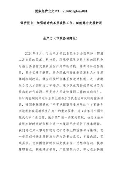 【七哥公文】2025年:调研报告:加强新时代基层政协工作、赋能地方发展新质生产力(市政协城建组)+更多免费公文+VX:QiGeGongWen2024+更多免费公文+VX:QiGeGongWen2024
