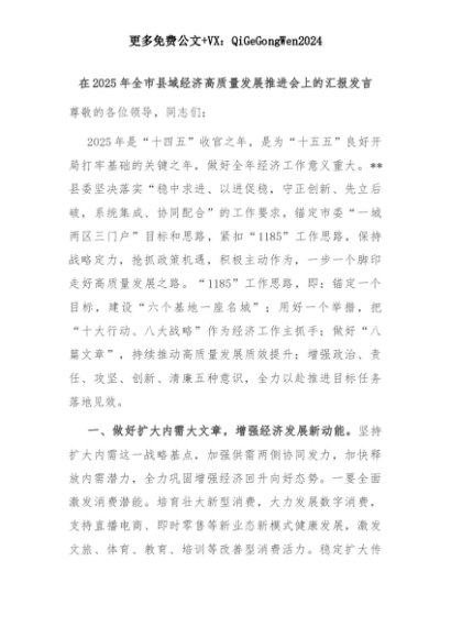【七哥公文】2025年:在2025年全市县域经济高质量发展推进会上的汇报发言+更多免费公文+VX:QiGeGongWen2024+更多免费公文+VX:QiGeGongWen2024