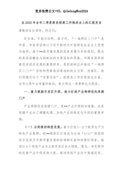 【七哥公文】2025年:在2025年全市二季度商务招商工作推进会上的汇报发言+更多免费公文+VX:QiGeGongWen2024+更多免费公文+VX:QiGeGongWen2024