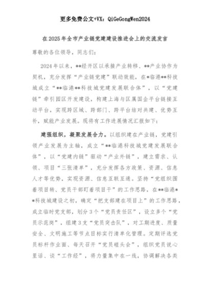 【七哥公文】2025年:在2025年全市产业链党建建设推进会上的交流发言+更多免费公文+VX:QiGeGongWen2024+更多免费公文+VX:QiGeGongWen2024
