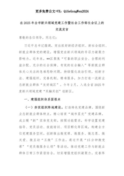 【七哥公文】2025年:在2025年全市新兴领域党建工作暨社会工作部长会议上的交流发言+更多免费公文+VX:QiGeGongWen2024+更多免费公文+VX:QiGeGongWen2024
