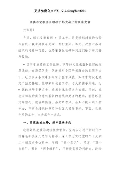 【七哥公文】2025年:区委书记在全区领导干部大会上的表态发言+更多免费公文+VX:QiGeGongWen2024+更多免费公文+VX:QiGeGongWen2024
