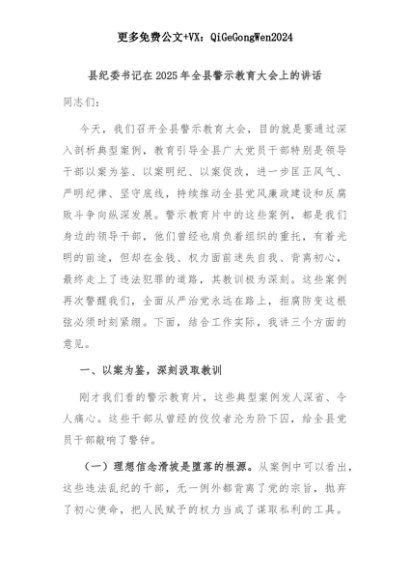 【七哥公文】2025年:县纪委书记在2025年全县警示教育大会上的讲话+更多免费公文+VX:QiGeGongWen2024+更多免费公文+VX:QiGeGongWen2024