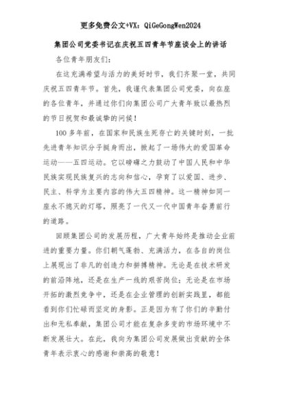 【七哥公文】2025年:集团公司党委书记在庆祝五四青年节座谈会上的讲话+更多免费公文+VX:QiGeGongWen2024+更多免费公文+VX:QiGeGongWen2024