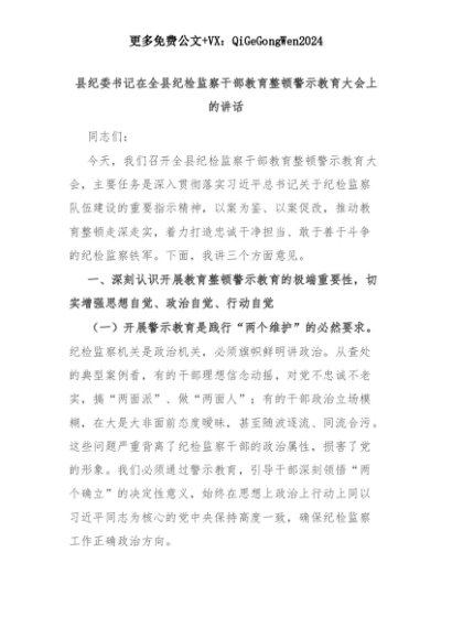 【七哥公文】2025年:县纪委书记在全县纪检监察干部教育整顿警示教育大会上的讲话+更多免费公文+VX:QiGeGongWen2024+更多免费公文+VX:QiGeGongWen2024
