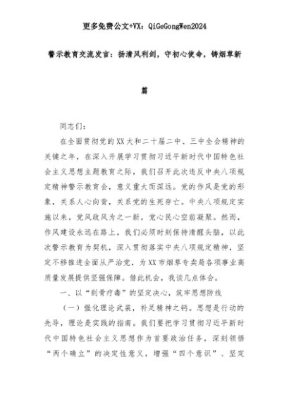 【七哥公文】2025年:警示教育交流发言:扬清风利剑,守初心使命,铸烟草新篇+更多免费公文+VX:QiGeGongWen2024+更多免费公文+VX:QiGeGongWen2024
