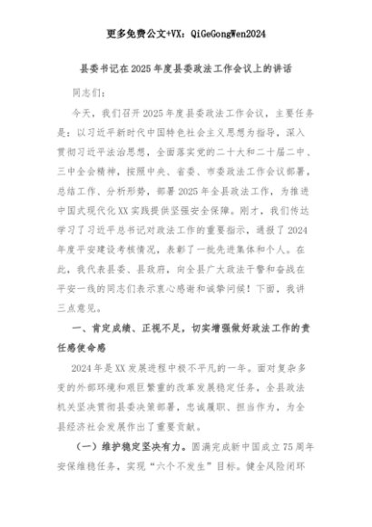 【七哥公文】2025年:县委书记在2025年度县委政法工作会议上的讲话+更多免费公文+VX:QiGeGongWen2024+更多免费公文+VX:QiGeGongWen2024