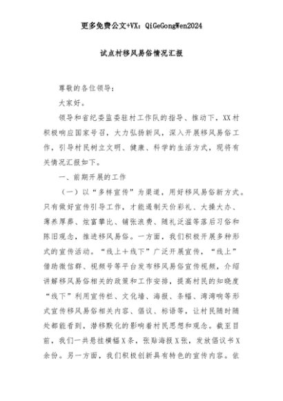 【七哥公文】2025年:试点村移风易俗情况汇报+更多免费公文+VX:QiGeGongWen2024+更多免费公文+VX:QiGeGongWen2024