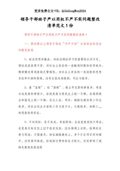 【七哥公文】2025年:领导干部班子严以用权不严不实问题整改清单范文1份+更多免费公文+VX:QiGeGongWen2024+更多免费公文+VX:QiGeGongWen2024