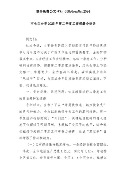 【七哥公文】2025年:市长在全市2025年第二季度工作部署会讲话+更多免费公文+VX:QiGeGongWen2024+更多免费公文+VX:QiGeGongWen2024