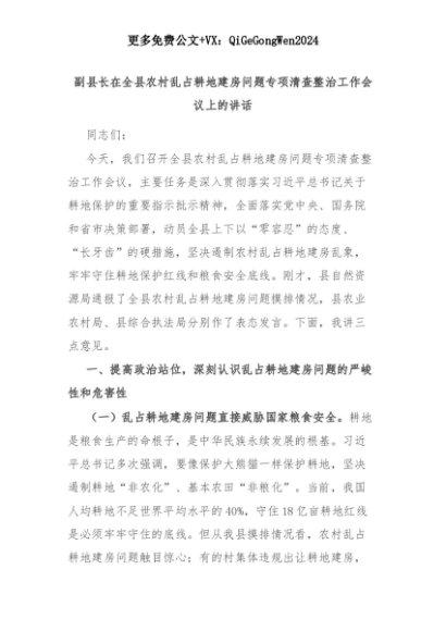 【七哥公文】2025年:副县长在全县农村乱占耕地建房问题专项清查整治工作会议上的讲话+更多免费公文+VX:QiGeGongWen2024+更多免费公文+VX:QiGeGongWen2024