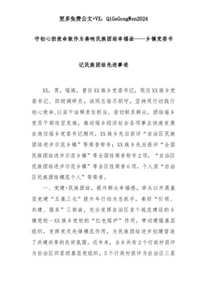 【七哥公文】2025年:守初心担使命敢作为奏响民族团结幸福曲——乡镇党委书记民族团结先进事迹+更多免费公文+VX:QiGeGongWen2024+更多免费公文+VX:QiGeGongWen2024