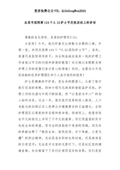 【七哥公文】2025年:在某市医院第114个5.12护士节庆祝活动上的讲话+更多免费公文+VX:QiGeGongWen2024+更多免费公文+VX:QiGeGongWen2024