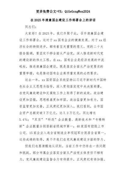 【七哥公文】2025年:在2025年清廉国企建设工作部署会上的讲话+更多免费公文+VX:QiGeGongWen2024+更多免费公文+VX:QiGeGongWen2024