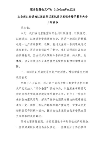 【七哥公文】2025年:在全州以案说德以案说纪以案说法以案说责警示教育大会上的讲话+更多免费公文+VX:QiGeGongWen2024+更多免费公文+VX:QiGeGongWen2024