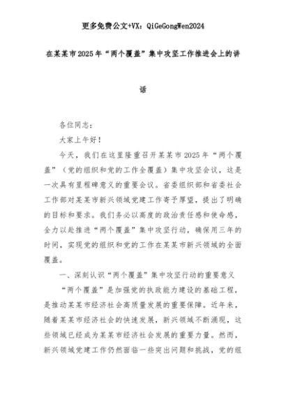 【七哥公文】2025年:在某某市2025年“两个覆盖”集中攻坚工作推进会上的讲话+更多免费公文+VX:QiGeGongWen2024+更多免费公文+VX:QiGeGongWen2024