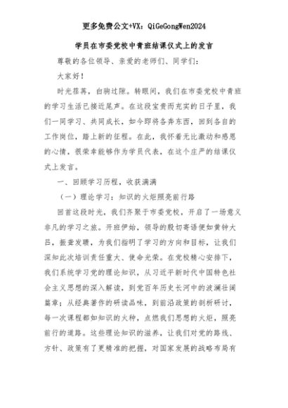 【七哥公文】2025年:学员在市委党校中青班结课仪式上的发言+更多免费公文+VX:QiGeGongWen2024+更多免费公文+VX:QiGeGongWen2024