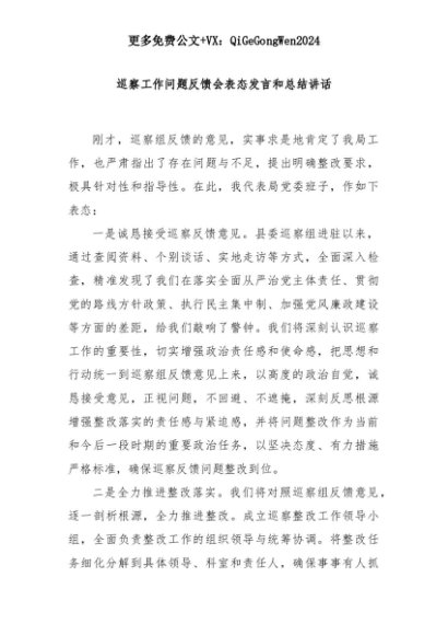 【七哥公文】2025年:巡察工作问题反馈会表态发言和总结讲话+更多免费公文+VX:QiGeGongWen2024+更多免费公文+VX:QiGeGongWen2024