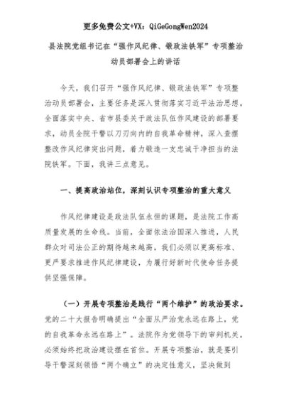 【七哥公文】2025年:县法院党组书记在“强作风纪律、锻政法铁军”专项整治动员部署会上的讲话+更多免费公文+VX:QiGeGongWen2024+更多免费公文+VX:QiGeGongWen2024