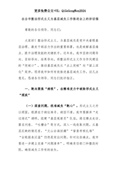 【七哥公文】2025年:在全市整治形式主义为基层减负工作推进会上的讲话稿+更多免费公文+VX:QiGeGongWen2024+更多免费公文+VX:QiGeGongWen2024