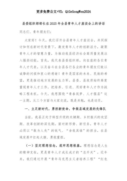 【七哥公文】2025年:县委组织部部长在2025年全县青年人才座谈会上的讲话+更多免费公文+VX:QiGeGongWen2024+更多免费公文+VX:QiGeGongWen2024