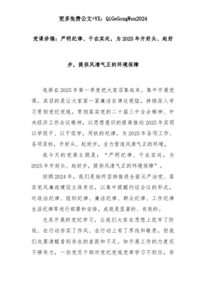 【七哥公文】2025年:党课讲稿:严明纪律、干在实处,为2025年开好头、起好步,提供风清气正的环境保障+更多免费公文+VX:QiGeGongWen2024+更多免费公文+VX:QiGeGongWen2024