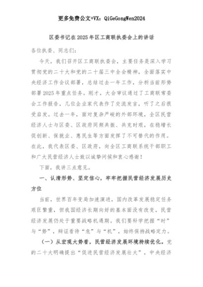 【七哥公文】2025年:区委书记在2025年区工商联执委会上的讲话+更多免费公文+VX:QiGeGongWen2024+更多免费公文+VX:QiGeGongWen2024