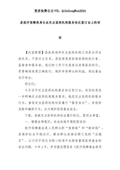 【七哥公文】2025年:县医疗保障局局长在定点医药机构服务协议签订会上的讲话+更多免费公文+VX:QiGeGongWen2024+更多免费公文+VX:QiGeGongWen2024