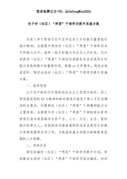 【七哥公文】2025年:关于村(社区)“两委”干部学历提升实施方案+更多免费公文+VX:QiGeGongWen2024+更多免费公文+VX:QiGeGongWen2024