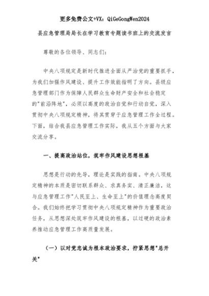 【七哥公文】2025年:县应急管理局局长在学习教育专题读书班上的交流发言+更多免费公文+VX:QiGeGongWen2024+更多免费公文+VX:QiGeGongWen2024