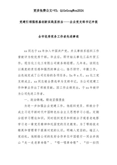 【七哥公文】2025年:党建引领强根基创新实践显担当——企业党支部书记申报全市优秀党务工作者先进事迹+更多免费公文+VX:QiGeGongWen2024+更多免费公文+VX:QiGeGongWen2024