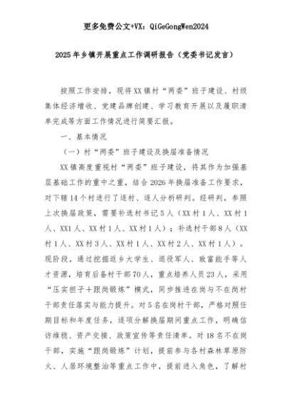 【七哥公文】2025年:2025年乡镇开展重点工作调研报告(党委书记发言)+更多免费公文+VX:QiGeGongWen2024+更多免费公文+VX:QiGeGongWen2024