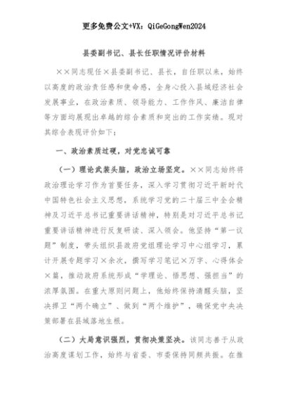 【七哥公文】2025年:县委副书记、县长任职情况评价材料+更多免费公文+VX:QiGeGongWen2024+更多免费公文+VX:QiGeGongWen2024