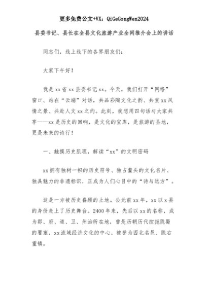 【七哥公文】2025年:县委书记、县长在全县文化旅游产业全网推介会上的讲话+更多免费公文+VX:QiGeGongWen2024+更多免费公文+VX:QiGeGongWen2024