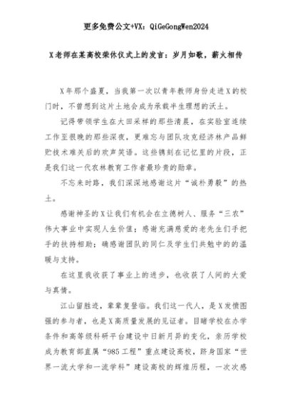 【七哥公文】2025年:X老师在某高校荣休仪式上的发言:岁月如歌,薪火相传+更多免费公文+VX:QiGeGongWen2024+更多免费公文+VX:QiGeGongWen2024
