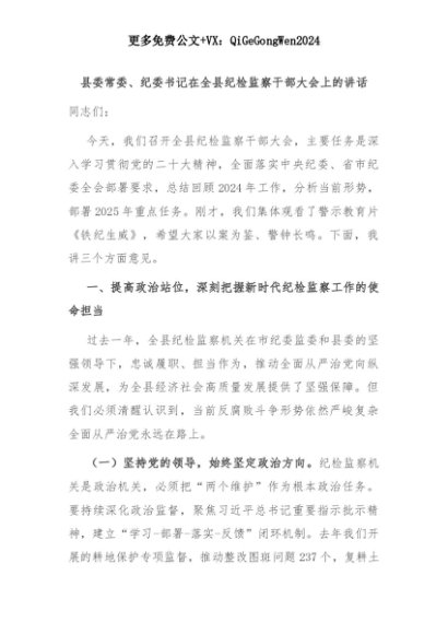 【七哥公文】2025年:县委常委、纪委书记在全县纪检监察干部大会上的讲话+更多免费公文+VX:QiGeGongWen2024+更多免费公文+VX:QiGeGongWen2024