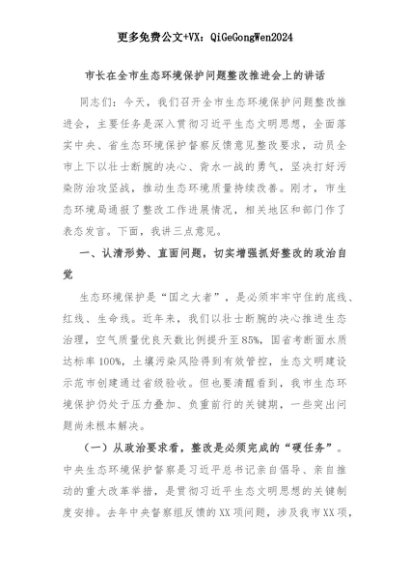 【七哥公文】2025年:市长在全市生态环境保护问题整改推进会上的讲话+更多免费公文+VX:QiGeGongWen2024+更多免费公文+VX:QiGeGongWen2024