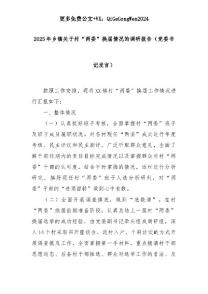 【七哥公文】2025年:2025年乡镇关于村“两委”换届情况的调研报告(党委书记发言)+更多免费公文+VX:QiGeGongWen2024+更多免费公文+VX:QiGeGongWen2024