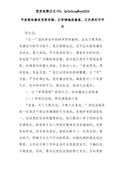 【七哥公文】2025年:节前集体廉政党课讲稿:以学铸魂筑廉基,正风肃纪守节关+更多免费公文+VX:QiGeGongWen2024+更多免费公文+VX:QiGeGongWen2024