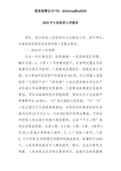 【七哥公文】2025年:2025年X县政府工作报告+更多免费公文+VX:QiGeGongWen2024+更多免费公文+VX:QiGeGongWen2024
