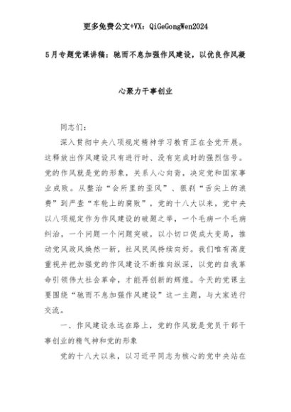 【七哥公文】2025年:5月专题党课讲稿:驰而不息加强作风建设,以优良作风凝心聚力干事创业+更多免费公文+VX:QiGeGongWen2024+更多免费公文+VX:QiGeGongWen2024
