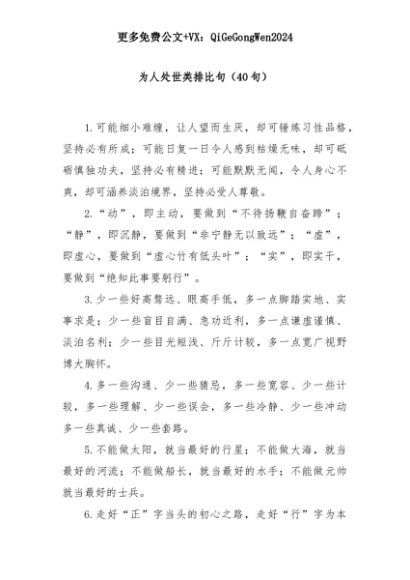 【七哥公文】2025年:(40句)为人处世类排比句+更多免费公文+VX:QiGeGongWen2024+更多免费公文+VX:QiGeGongWen2024