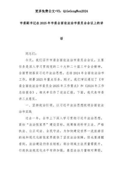 【七哥公文】2025年:市委副书记在2025年市委全面依法治市委员会会议上的讲话+更多免费公文+VX:QiGeGongWen2024+更多免费公文+VX:QiGeGongWen2024