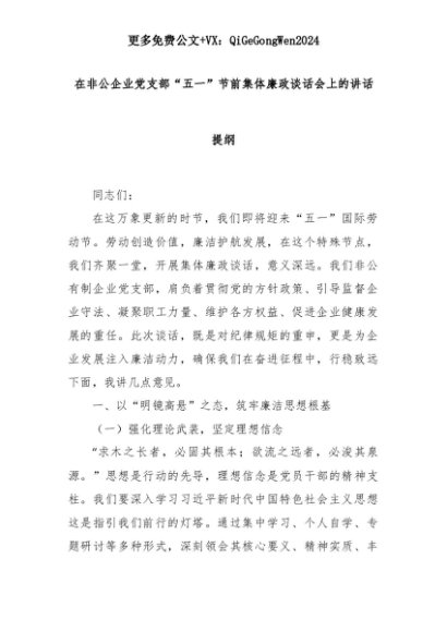 【七哥公文】2025年:在非公企业党支部“五一”节前集体廉政谈话会上的讲话提纲+更多免费公文+VX:QiGeGongWen2024+更多免费公文+VX:QiGeGongWen2024
