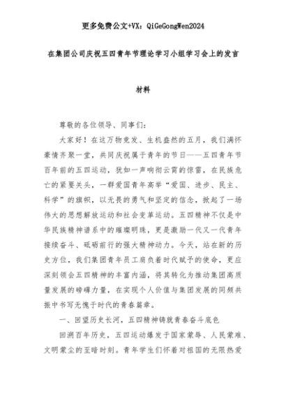 【七哥公文】2025年:在集团公司庆祝五四青年节理论学习小组学习会上的发言材料+更多免费公文+VX:QiGeGongWen2024+更多免费公文+VX:QiGeGongWen2024
