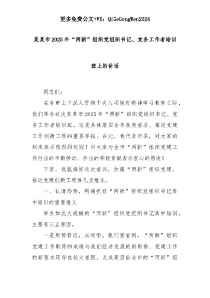 【七哥公文】2025年:某某市2025年“两新”组织党组织书记、党务工作者培训班上的讲话+更多免费公文+VX:QiGeGongWen2024+更多免费公文+VX:QiGeGongWen2024
